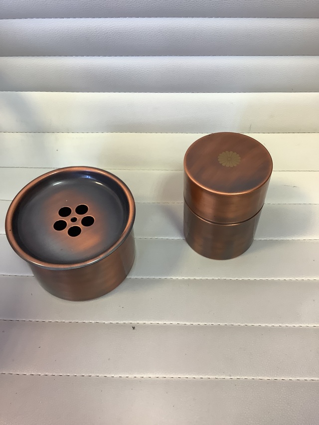 銅製の建水や茶筒は使えば使うほど味わい深い色合いにエイジングされますので、新品とは違った魅力がありますね✨